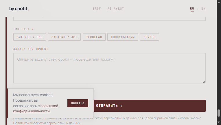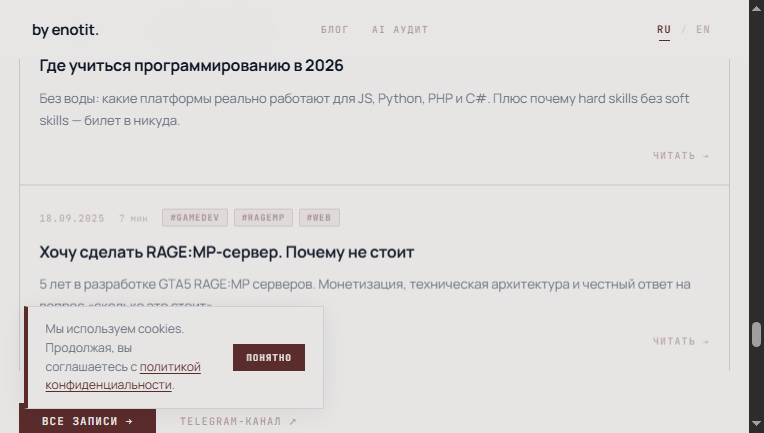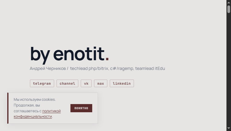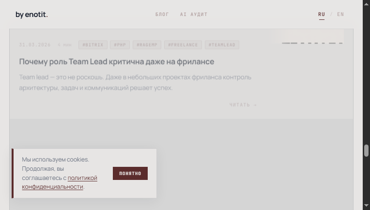 enotit — techlead PHP/Bitrix, C#, Python. Архитектура веб-проектов, AI и RAG-системы, управление IT-командами и консалтинг. |